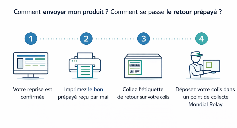 ⚠️ Produits non repris : les appareils endommagés, non fonctionnels, contrefaits, blacklistés, ou présentant une batterie gonflée seront valorisés 0 €, non retournés et pourront être détruits.