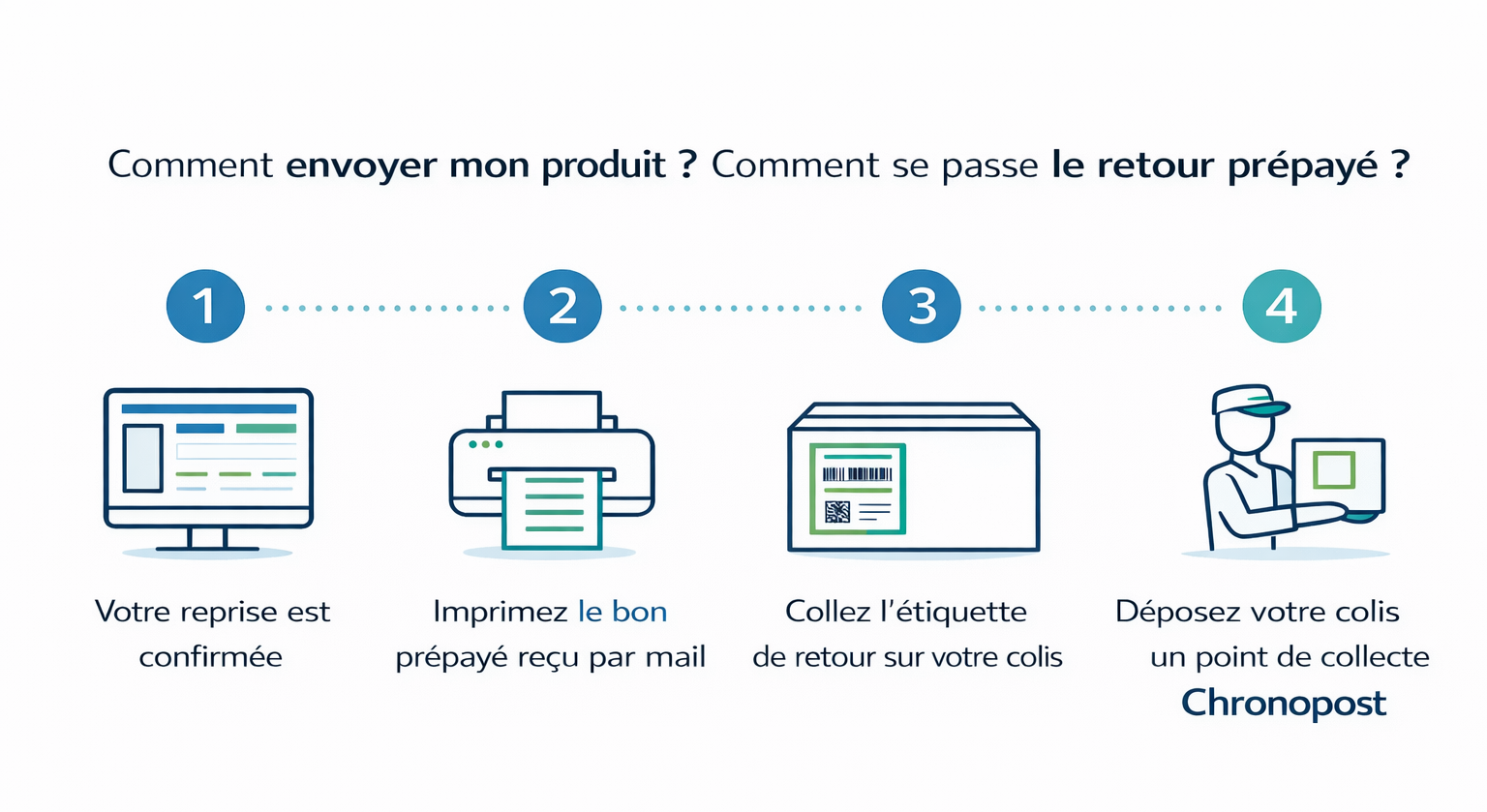 Vous serez informé par email à chaque étape de la reprise. Vous pouvez également consulter votre espace dédié « Suivre ma reprise ».